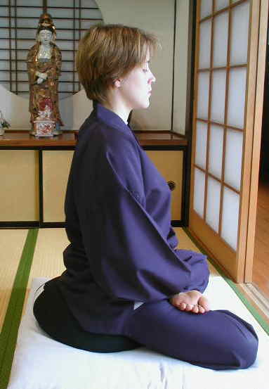 Hankafuza Sit with the left leg on the right thigh. ![]() Japanese - Style Kneeling Sit with the cushion under your hips in a kneeling position. The two big toes should be crossed behind you with a space of about two fists between the knees. If this becomes painful, place the cushion between the legs and sit on it like a horse. ![]() ![]() We may use any of these sitting styles in our Zen practice. We may alternate our leg position from right to left and left to right as necessary. |