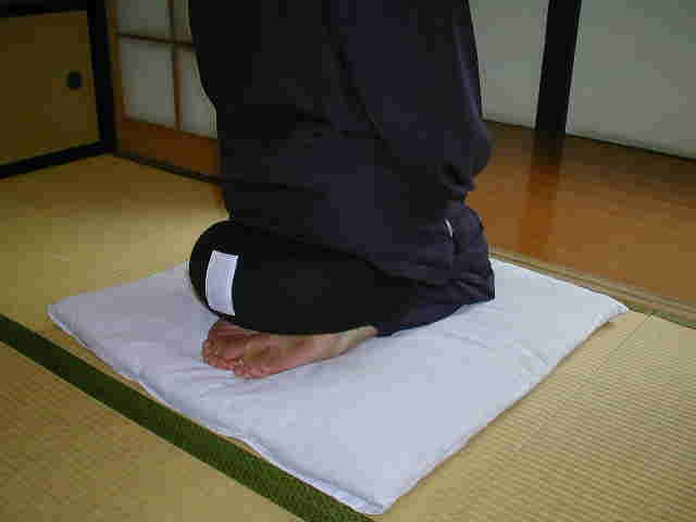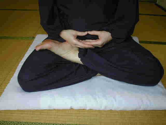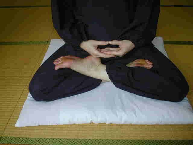 Hankafuza Sit with the left leg on the right thigh. ![]() Japanese - Style Kneeling Sit with the cushion under your hips in a kneeling position. The two big toes should be crossed behind you with a space of about two fists between the knees. If this becomes painful, place the cushion between the legs and sit on it like a horse. ![]() ![]() We may use any of these sitting styles in our Zen practice. We may alternate our leg position from right to left and left to right as necessary. |