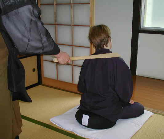 home.![]() Receiving Kyosaku In Soto sect temples a light touch is given on the right shoulder. At this time tilt the head to the left and make a gassho (hands pressed together in pray fashion). In Toshoji, the founder said that when we start Zazen we should never break our form. Just tilt the head to the left and receive Kyosaku. After this, make a gassho and return to Zazen. |