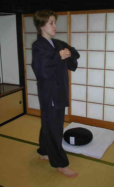 to say more, you must leave.Before standing up bow once. Exit the room and bow three times in the entrance before returning to your seat in the Zendo. Basically, in Dokusan, we must always bow three times though in Toshoji, because there are sometimes many people doing Dokusan, we only bow once. When going to Dokusan, do not go too quick nor too slow. We disturb other people with loud running or by taking too much time walking slowly. Hands should be in Sashu when going to and from Dokusan and in Gassho while in the Dokusan room. Waiting for and going to and from Dokusan is not a rest time. Carefully and seriously we must always become one with our Koan. |